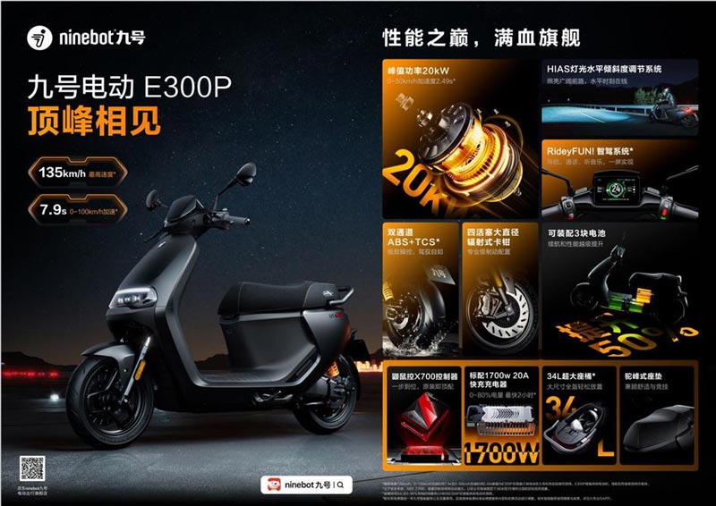 九號(hào)電動(dòng)E300P可謂是全場(chǎng)焦點(diǎn)般的存在,作為一款主打高性能的智能電摩,實(shí)現(xiàn)了可搭載三塊電池的新突破,整車的性能和續(xù)航都有一個(gè)大幅度的提升:峰值功率為20kW,最 高速度可達(dá)135km/h,0-100km/h加速時(shí)間可達(dá)7.9s,以強(qiáng)勁的性能,刷新世人對(duì)性能的看法。