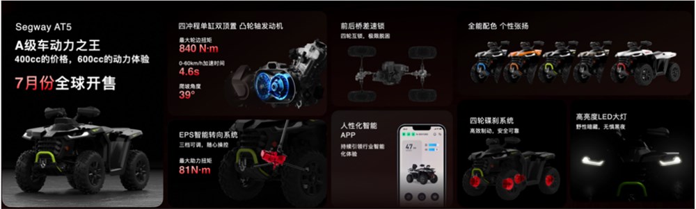 這款被譽(yù)為“A級(jí)車動(dòng)力王”的 Segway AT5 全地形車,在發(fā)布會(huì)上大放異彩。它擁有強(qiáng)勁的動(dòng)力和卓越的配置,600cc的動(dòng)力搭配400cc的售價(jià),為駕車者帶來(lái)了更加震撼的越野感和更具心動(dòng)的價(jià)格。Segway AT5 采用的是全自主研發(fā)的四沖程單缸雙頂置凸輪軸發(fā)動(dòng)機(jī),其最 高速度為100km/h,最 大車輪轉(zhuǎn)矩為840N·m,0-60km/h的加速時(shí)間只需要4. 6 秒,這樣強(qiáng)勁的動(dòng)力性能使得它的駕駛員能夠在任何復(fù)雜的地形中暢通無(wú)阻。